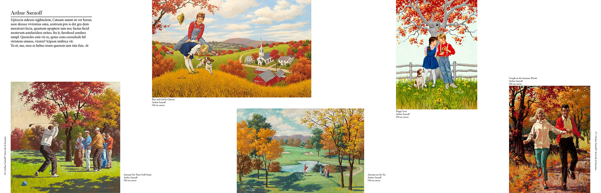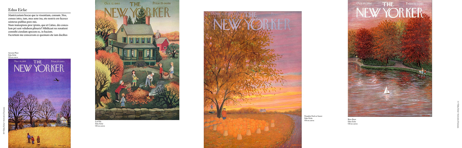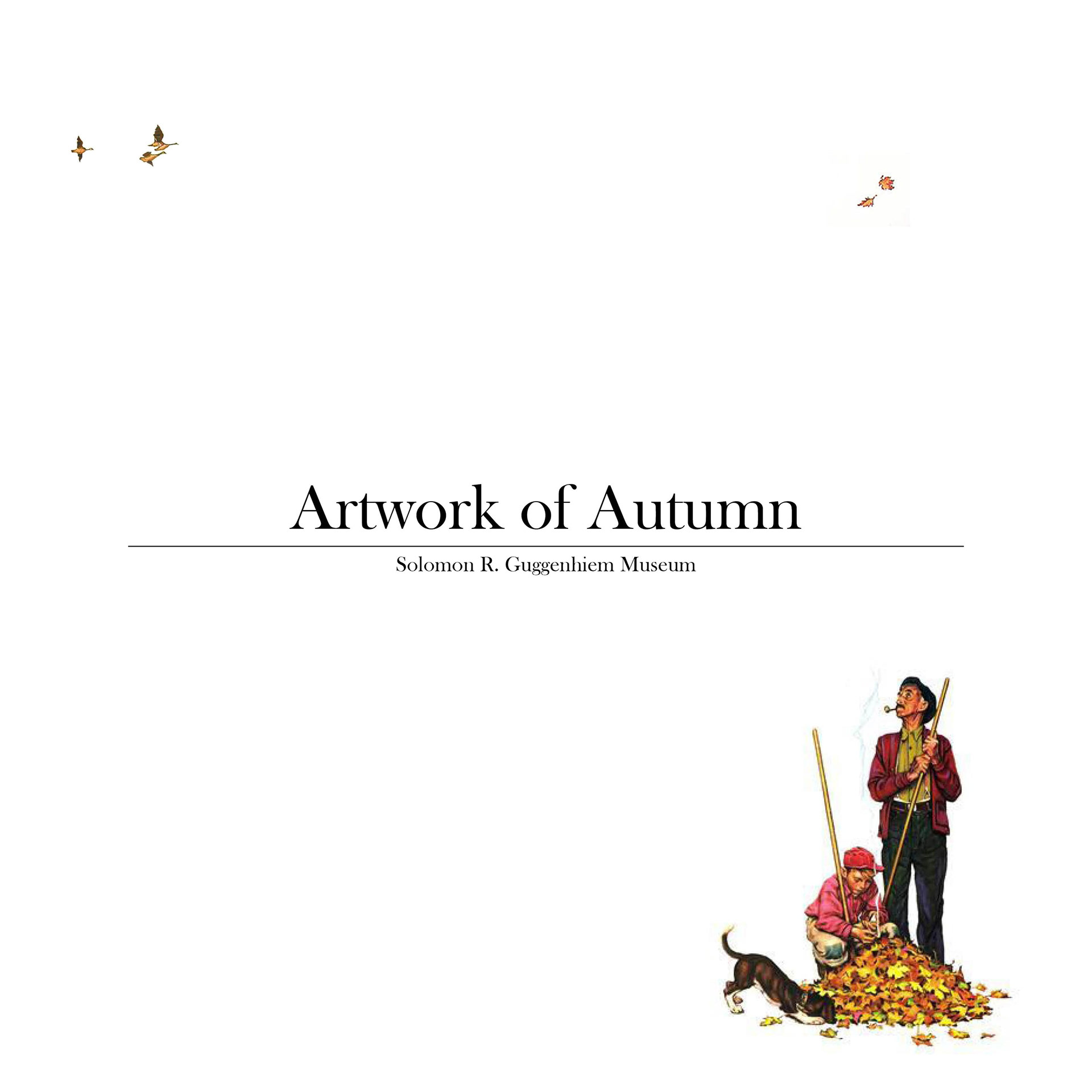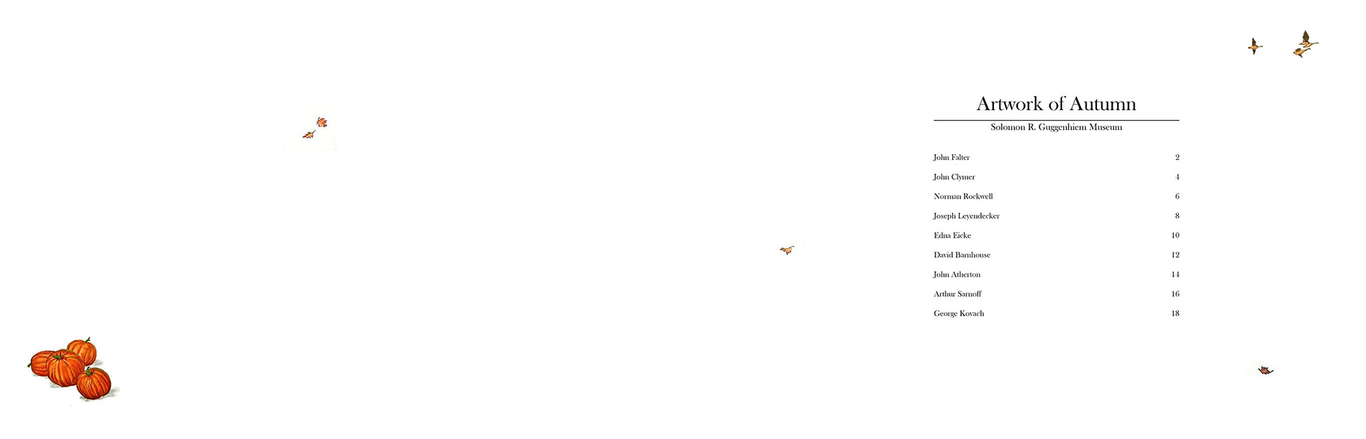 A gallery guide concept for an exhibit titled "Artwork of Autumn" held at the Solomon R. Guggenhiem Museum. The exhibit would feature a compilation of editorial artwork created by several different artists, all sharing a common theme of autumn.