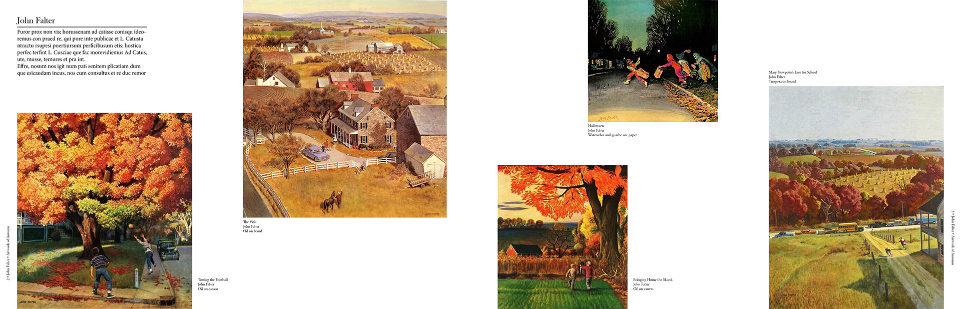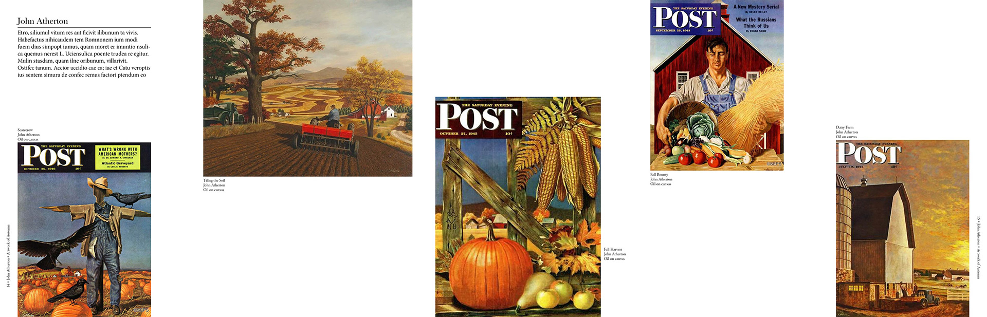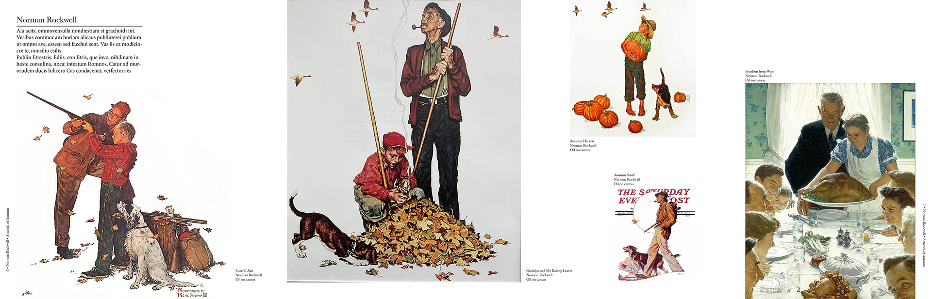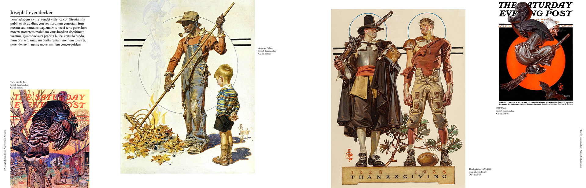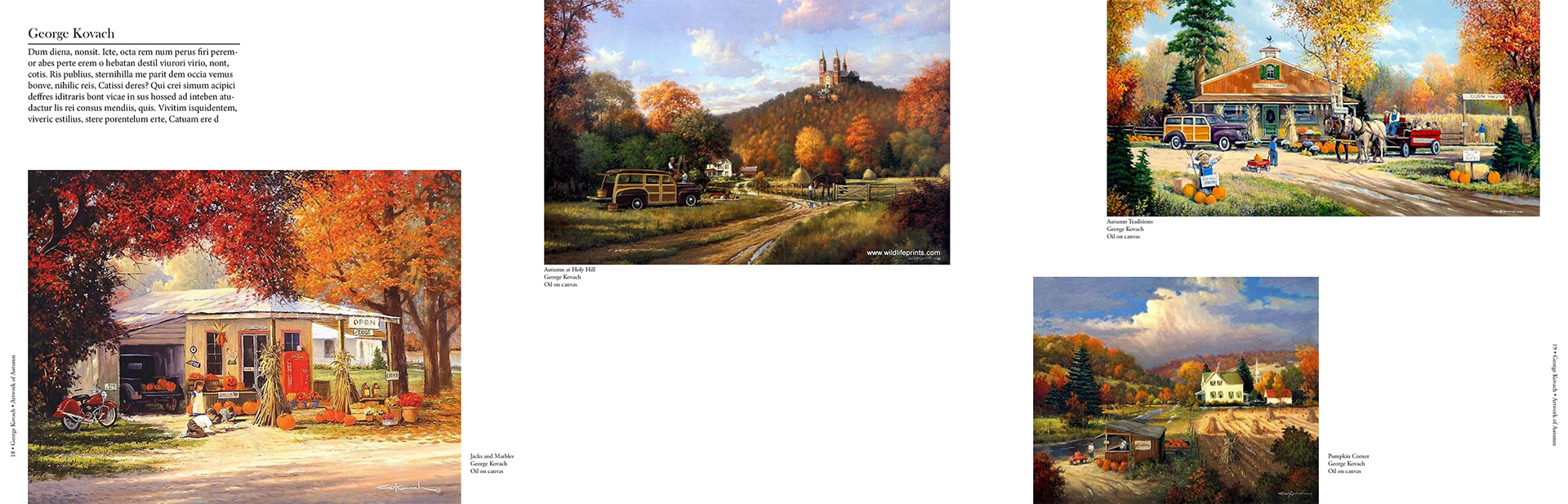 A gallery guide concept for an exhibit titled "Artwork of Autumn" held at the Solomon R. Guggenhiem Museum. The exhibit would feature a compilation of editorial artwork created by several different artists, all sharing a common theme of autumn.
