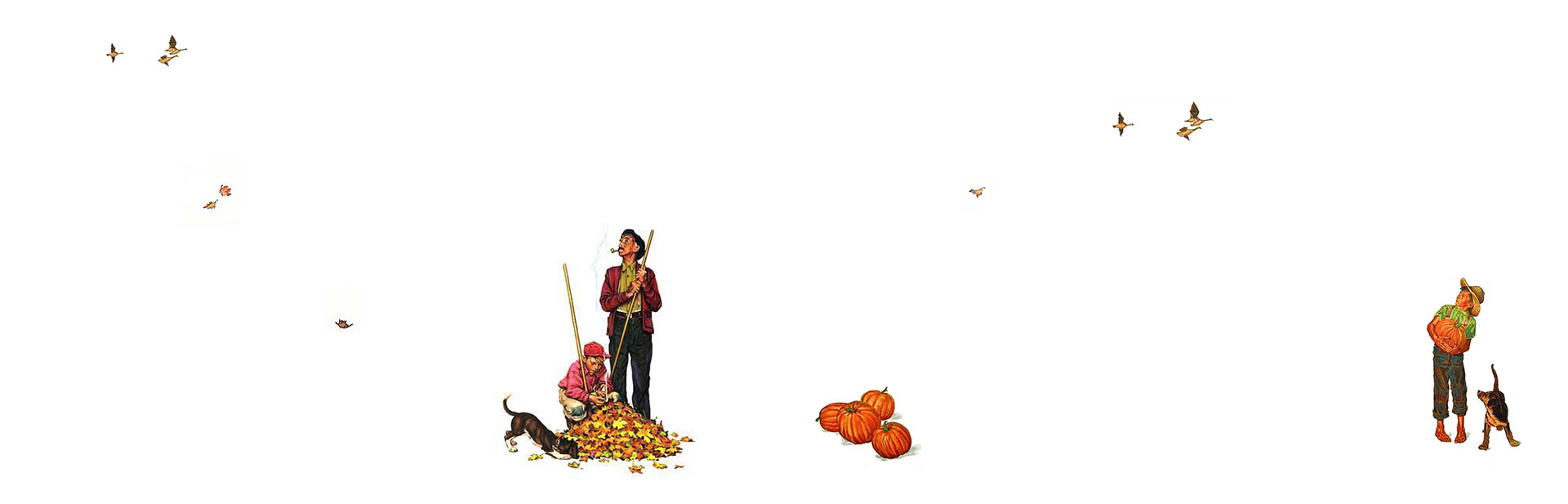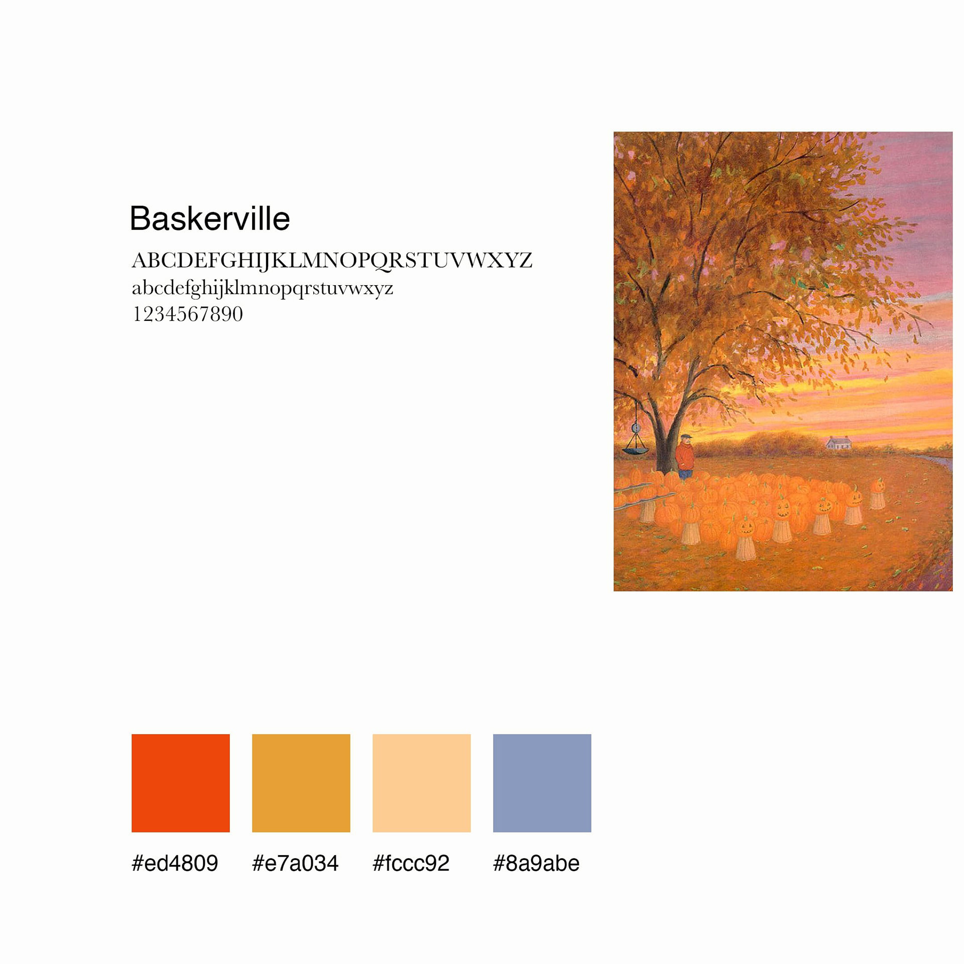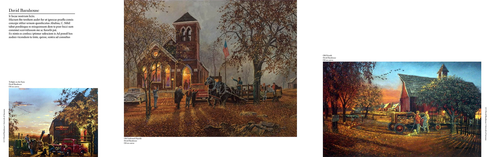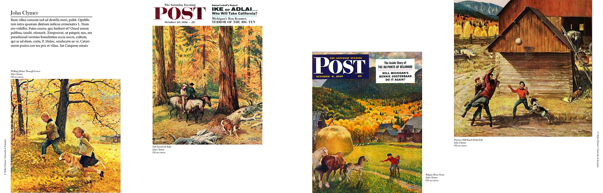 A gallery guide concept for an exhibit titled "Artwork of Autumn" held at the Solomon R. Guggenhiem Museum. The exhibit would feature a compilation of editorial artwork created by several different artists, all sharing a common theme of autumn.